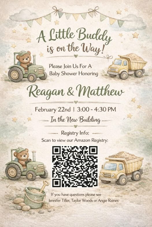 A little buddy is on the way! Please join us for a baby shower honoring Reagan and Matthew McCoy on Sunday, February 22 from 3-4:30pm. They are registered on Amazon.
